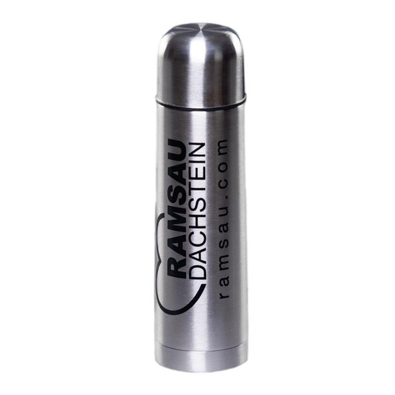 Silberne Thermosflasche, Füllmenge 0,5l mit Ramsau am Dachstein Logo Aufdruck. Ideal für kurze Wanderungen und Familienausflüge. Der integrierte Trinkbecher vereinfacht die Handhabung mit heißen als auch kalten Getränken.