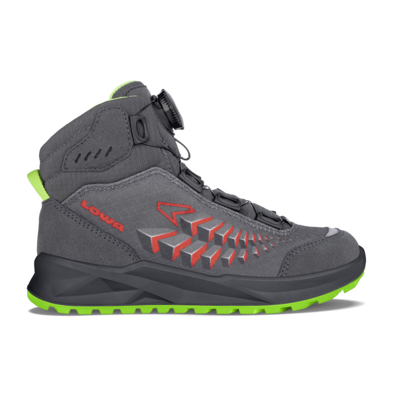Durch die herstellereigene DYNAPU-Zwischensohle bieten die Kid's Ferrox GTX Mid eine hervorragende Dämpfung, die auch nach tausend Kompressionen ihre Rückstellkraft behält. Die Dämpfung wird nochmals verbessert durch die gute Verbindung von Sohle und Schaft, die über ein aufwendiges Anspritzverfahren mit PU-Schaum bewerkstelligt wird. Das Design der Schuhe basiert auf einem speziell auf die Fuß-Anatomie von Kindern angepassten Leisten. Und der BOA-Drehverschluss macht das An- und Ausziehen zum sprichwörtlichen Kinderspiel. Bei Lowa denkt man einfach an alles!