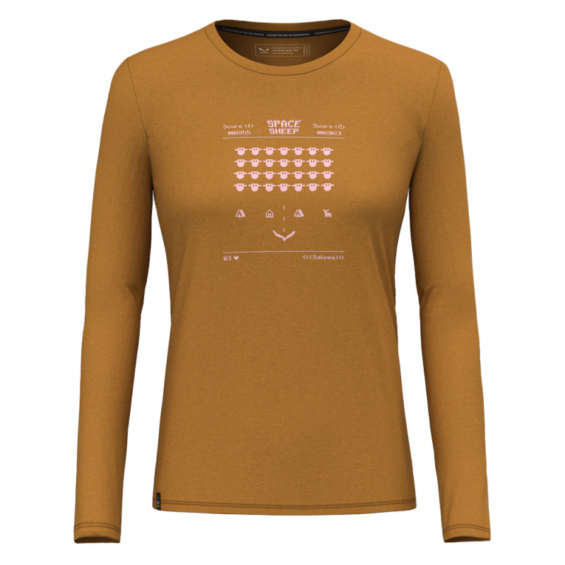 Aber auch im Design punktet das langärmelige T-Shirt: Die Grafik – unsere kleinen „Space Sheeps“ – ist von einem kultigen Arcade-Videospiel inspiriert. Darüber hinaus wird das Longsleeve überwiegend aus natürlichen und erneuerbaren Materialien hergestellt und ist so Teil der Salewa Committed Kollektion, deren Produkte unsere zusätzlichen strengen Umwelt- und Nachhaltigkeitsstandards erfüllen. Das Pure Space Game Merino T-Shirt ist ein bequemer Allround-Baselayer in einer regulären Passform, der sich vor allem durch einen hohen Tragekomfort auszeichnet.