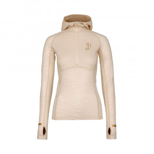 Johaug Advance Tech-Wool Hood Women - Dieses feminine und sportliche Kapuzen-Baselayer Shirt mit halbem Reißverschluss hält dich warm. Verfügt über eine technische Mischung aus Wolle und Synthetik, die mit Zonenfunktion gestrickt ist, die für Belüftung sorgt und gleichzeitig warm hält.