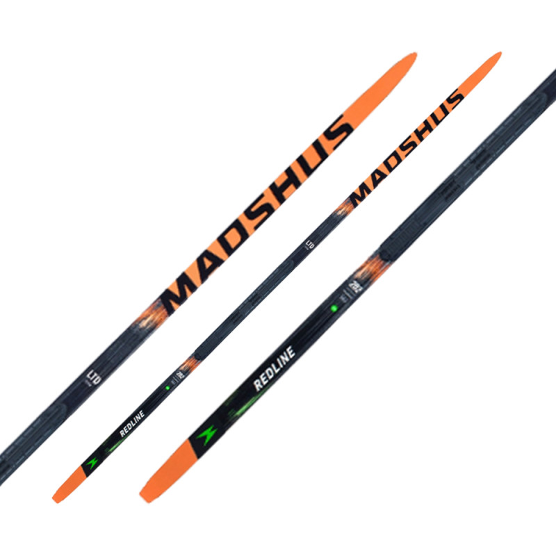 Madshus Redline klassik LTD 25/26 - The Redline klassik LTD is a premium klassik specialty ski with a brand new fluorocarbon-free base material that offers exceptional performance in certain snow conditions. Skiing is best when the snow is warm, wet, and has a coarse grainy texture, often called grain snow because of the small clumps of snow that form when the snow repeatedly melts and refreezes. The Redline klassik LTD has the highest camber of any of our klassik skis and is only recommended in conditions that require Klister grip waxes. As with all of our other Redline klassik skis, the camber on the Redline klassik LTD is designed to respond dynamically to the power you generate. The wax bag is designed to remain open when double poled for virtually frictionless gliding and closes symmetrically from both the front and back of the bag. This means your pedaling force is better distributed across the entire wax zone, maximizing the total grip force that can be generated, resulting in a better grip the harder you pedal!