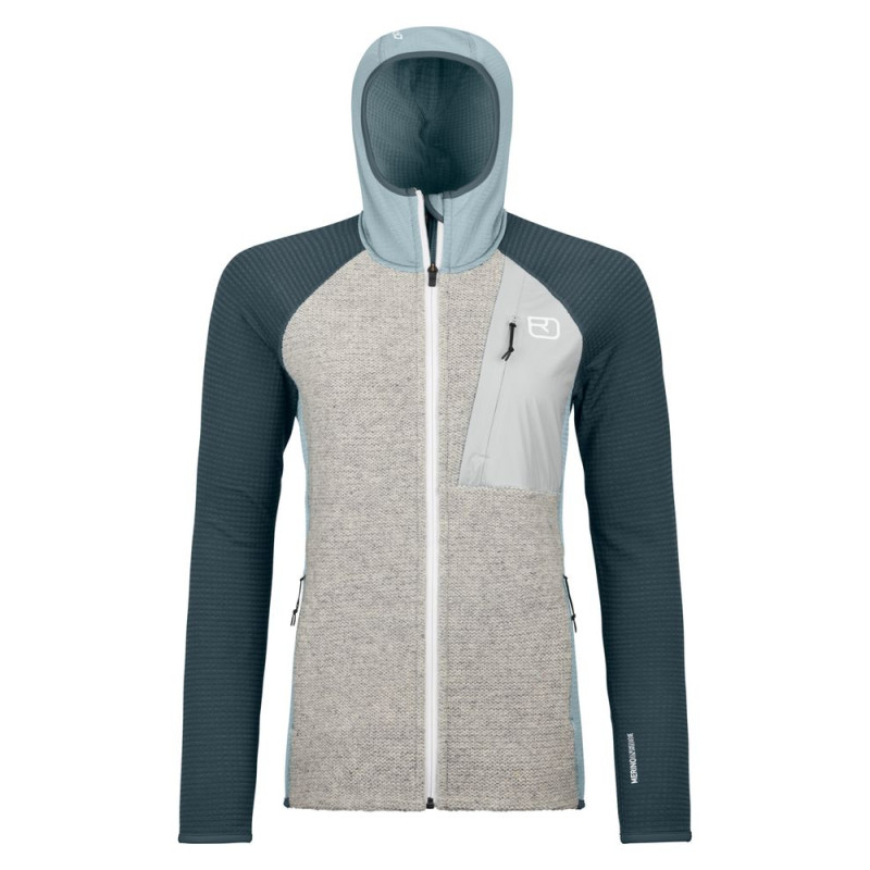 When the cold hits, the Ortovox Fleece GP Classic Knit Hoody Women keeps you warm and comfortable – whether you’re freeriding, ski touring, or just enjoying the mountains. The blend of classic wool knit and technical Merino Fleece Grid Plus delivers the perfect balance of warmth, breathability, and durability. Wool knit panels shield you from wind and cold, while the grid fleece interior offers excellent ventilation and lightweight insulation.